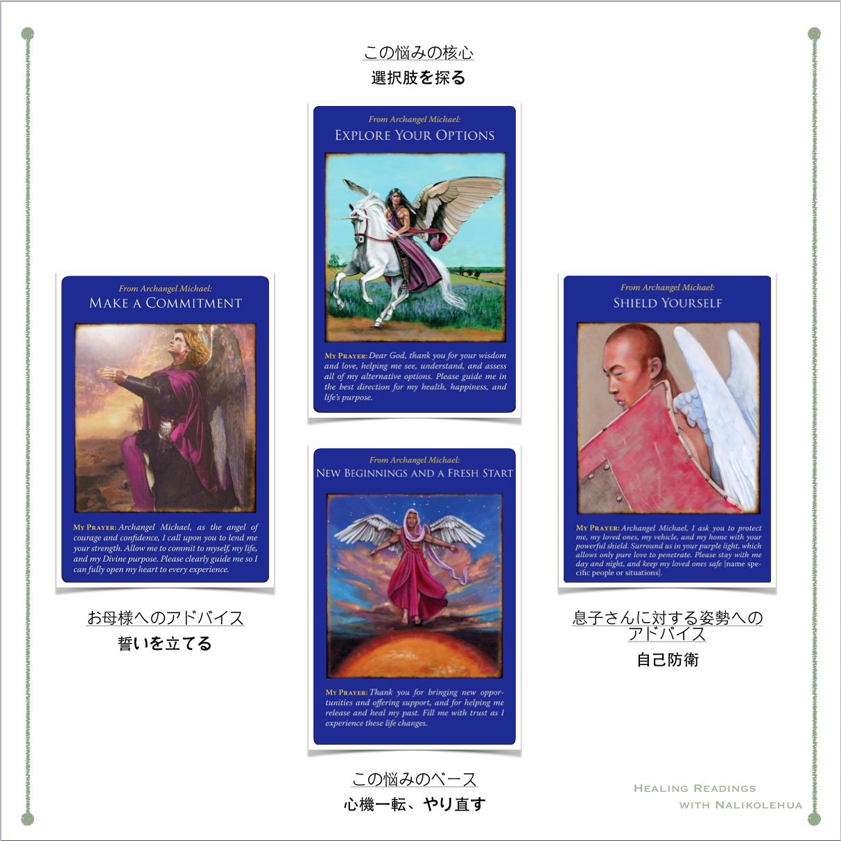 このカードはまさに何をどうしていいか分からない時に登場するカードで、ミカエルからのメッセージはこういうことです:望んでいることを、絶対に、必ず達成する、という誓いを立てること。もし今あなたが、自分の置かれている状況に対し少しでも「わたしがいけなかった」「幸せな家族なんて本当は存在しないのかも」という様な自分の望む結果とは相反する気持ちを抱いてると、望む結果を得ることは難しくなってしまう。でもしっかりと誓いを立てることで、確実に状況はいい方向へと向かう。