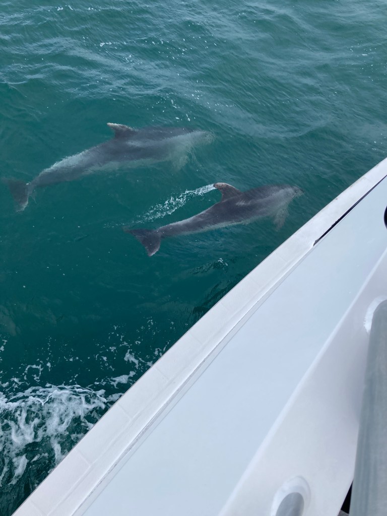 二、三頭のイルカちゃんが船と並走したり、ピョンピョンとその周りを跳ねて遊んでくれて、大感激しました。